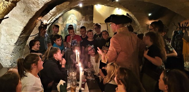 Zum krönenden Abschluss des 1.Tages wurden wir in Dresdens bekanntester Gaststätte, dem Sophienkeller, zum Abendessen erwartet. Die 2 Stunden vergingen wie im Fluge, weil uns Gaukler und vor allem der Zauberer super unterhielten.